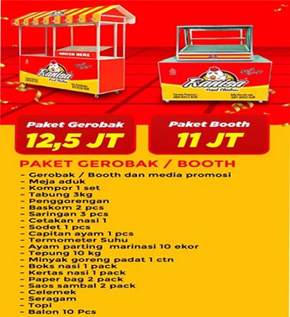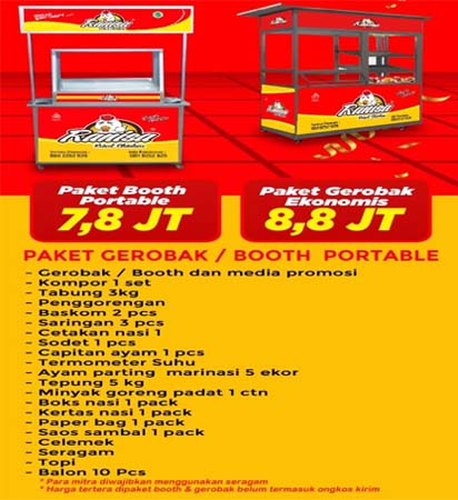 Ranisa Fried Chicken menyediakan beberapa paket pilihan yang dapat di sesuaikan, yaitu Paket Booth Basic (11 Juta), Paket Gerobak Standar (Rp. 12,5Jt), Kabar gembira khusus untuk Anda yang berada di wilayah Jabodetabek & Jawa Timur kini ada Paket Ekonomis, dengan harga mulai dari 7 juta-an saja Anda sudah dapat langsung bermitra bersama kami.